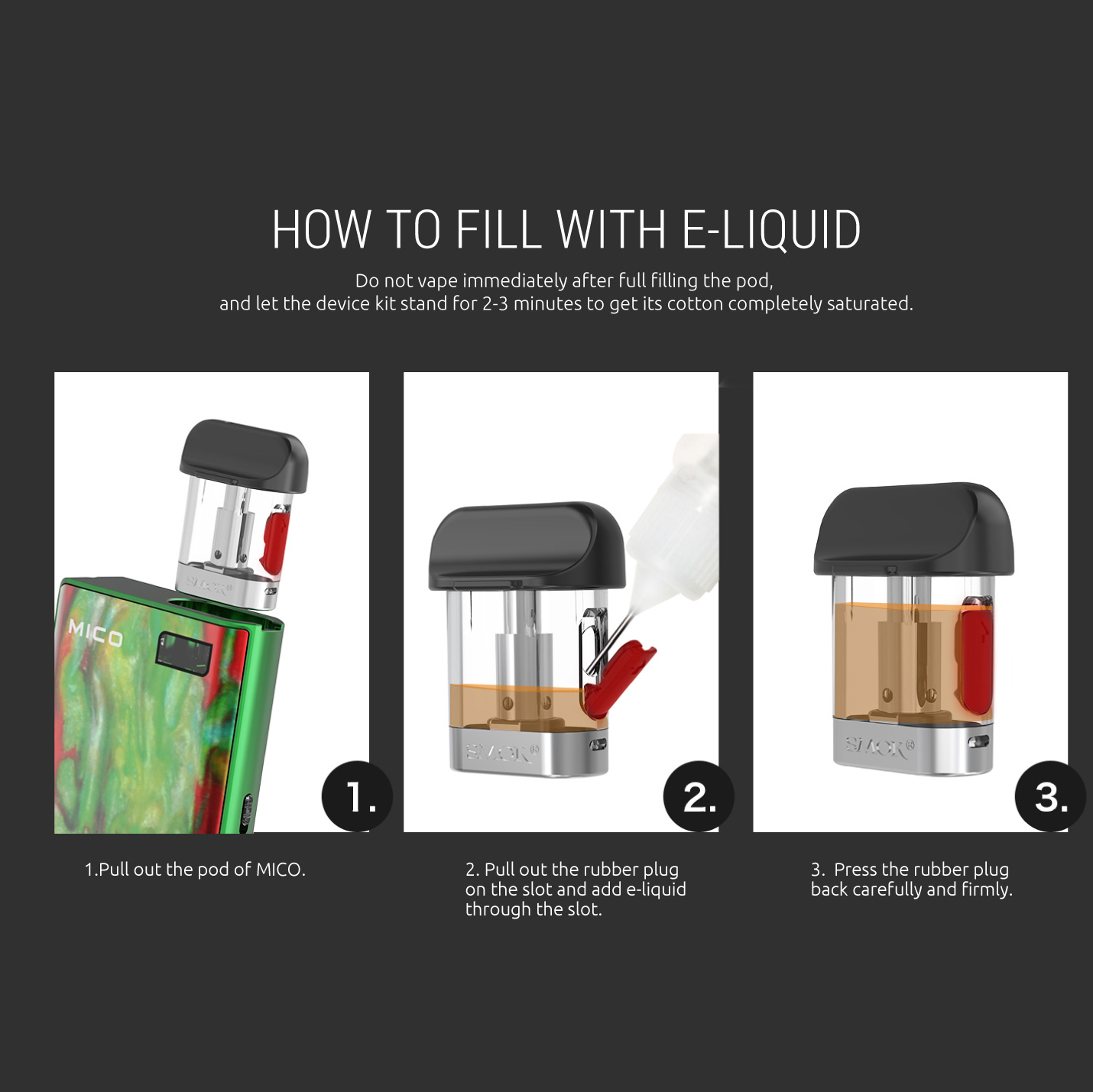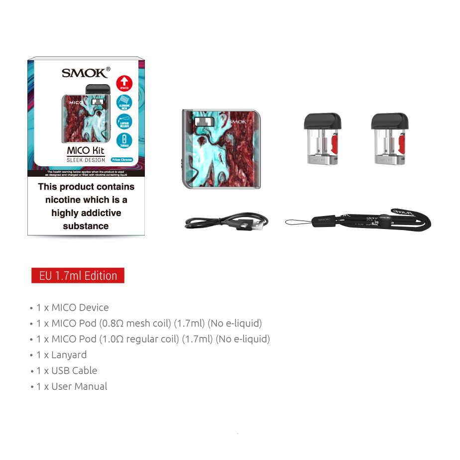 SMOK PICO Pod Kit passar perfekt i din hand. Med en klassisk resin-design, där de unika flerfärgade flytande linjerna ser ut som abstrakta oljemålningar och en stilfull, elegant högglansfinish. Drivs av ett inbyggt 700mAh lithiumbatteri räcker MICO tillräckligt länge för att låta dig vejpa hela dagen. Kitet inkluderar 2 st pods, en pod med 0.8Ω meshcoil och en pod 1.0Ω vanlig coil som erbjuder superb MTL-vejpupplevelse; båda har 1.7ml kapacitet och du kan drippa din favorit-e-juice i dem. Dessutom medföljer en handledsrem, både för bärbarhetens skull och ur dekorativ synpunkt.